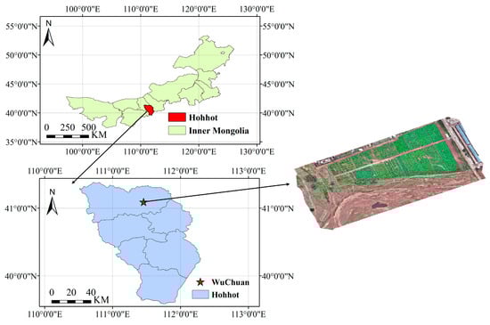 The study location served as the Xufeng Seed Industry’s potato-planting base in Wuchuan County, Hohhot City (shown in Figure 1). This facility is situated north of Hohhot City in the central region of the Inner Mongolia Autonomous Region. The coordinates of this location are 41°9′36” N, 111°36′10” E. Wuchuan County is characterized by a mesothermal continental monsoon climate. In such a climate, there are significant disparities between daytime and nighttime temperatures, as well as between winter and summer temperatures. The average elevation is between 1500 and 2000 m, the average temperature is 4.2 °C each year, and there is 360–366 mm of precipitation annually. Throughout the year, there is an abundance of light resources and enough sunshine, which supports agricultural photosynthesis.