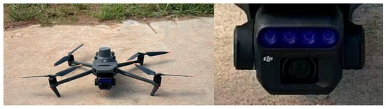 This study used a DJI Mavic 3M UAV (DJI, Shenzhen, China), as illustrated in Figure 3. The UAV is equipped with four multispectral sensors, which specifically correspond to the near-infrared band, the red band, the green band, and the red-edge band. It exhibits a net weight of approximately 958 g, a maximum weight of 1050 g at takeoff, and a maximum height of 6000 m during flight. The UAV imagery employed in this study was acquired on 10 July 2024, from 8:30 to 11:30 a.m., and on 12 August 2024, from 9:00 to 12:00 p.m. We collected UAV imagery on each specified day. With a solar altitude angle of roughly 50° and low humidity of roughly 40%, the data collection day was clear and less overcast, making it ideal for the UAV to precisely capture multispectral photos. Table 1 displays the pertinent UAV parameter settings.