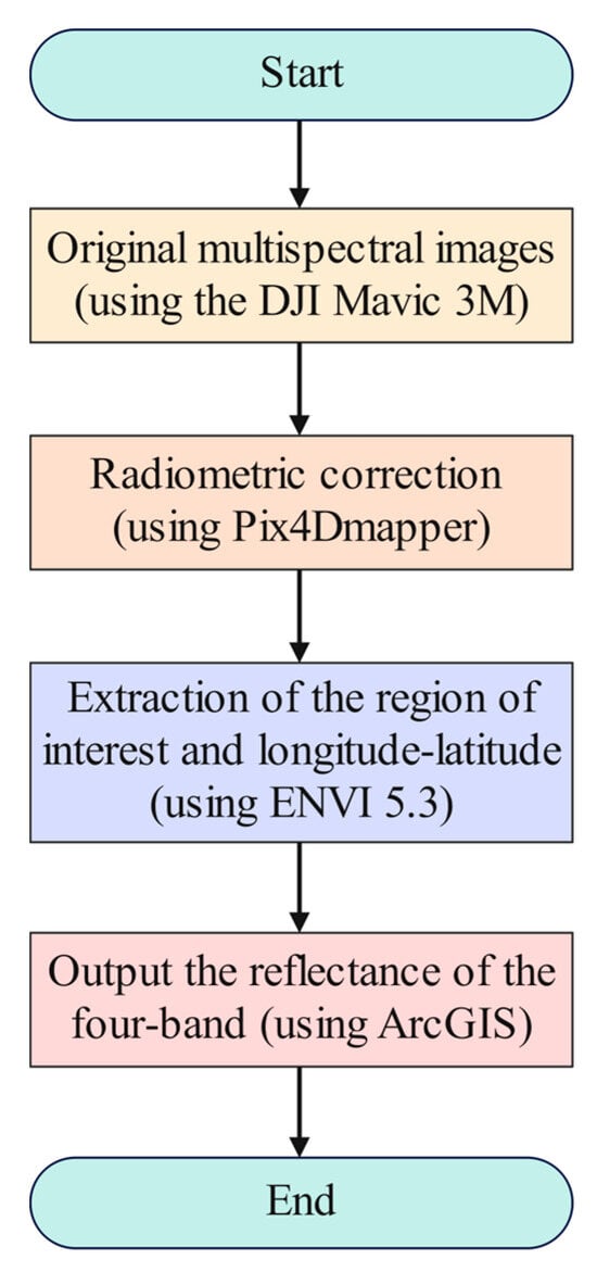 After the drone’s flight mission, we processed and reconstructed the acquired images through the DJI Smart Agriculture Platform (DJI SF Platform, available at https://ag.dji.com/cn/smartfarm-web, accessed on 2 September 2024) to generate the original multispectral images. Then, we radiometrically calibrated the original multispectral images with Pix4Dmapper software (version 4.5.6) to produce orthophotos. In this study, we extracted the longitude and latitude of the measurement sites with the help of the ENVI 5.3 software (version 5.3.1). During the real data collection process, we set up red flags at each sampling site to mark the extraction locations. The calibrated orthophoto and extracted latitude and longitude data were entered into the ArcGIS application (ArcGIS Pro 3.3). We obtained reflectance values in the red, green, red-edge, and near-infrared bands, after which we constructed VIs for subsequent testing. Figure 4 depicts the UAV image data preparation path.
