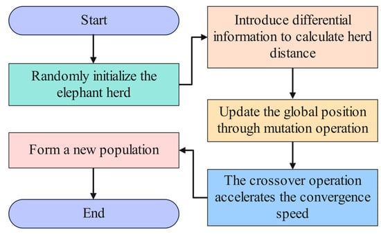 By integrating the strengths of the DE algorithm in global search and convergence rate with the advantages of the CM in local optimization and position update, the operational efficiency and search performance of the EHO algorithm can be significantly enhanced. It is possible to raise the likelihood of discovering the worldwide ideal answer. The process diagram for enhancing the EHO algorithm by fusing DE and CM is displayed in Figure 7.