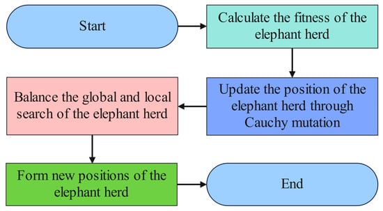- Conduct local and global searches in a balanced manner. It is feasible to flexibly balance local and global search by dynamically modifying the settings of Cauchy mutation. Equation (24) illustrates the function of the Cauchy mutation intensity.among them, is the initial Cauchy mutation intensity, represents the quantity of iterations underway, symbolizes the most iterations possible, and is the parameter used to adjust the rate of change. The EHO flowchart optimized using CM is shown in Figure 6. EHO’s update approach and local search capability have greatly improved.