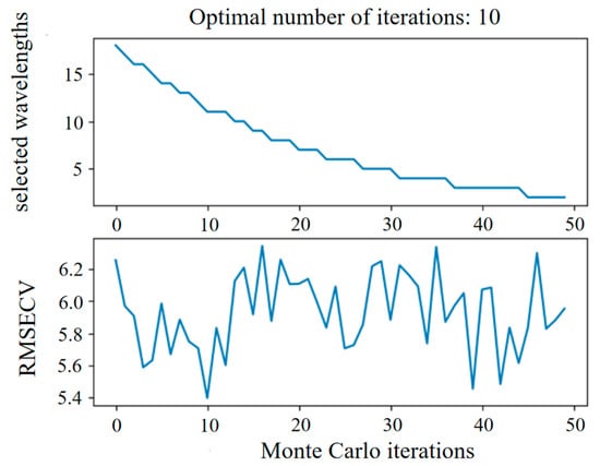 among them, is the cross-validation sample count, is the ith sample’s real amount, and is the ith sample’s anticipated amount obtained from the model established based on the currently screened VI subset. The CARS algorithm determines the optimal VI subset by continuously sampling with the aim of minimizing the RMSECV. Subsequent models then used the optimal VI subset to predict chlorophyll content.