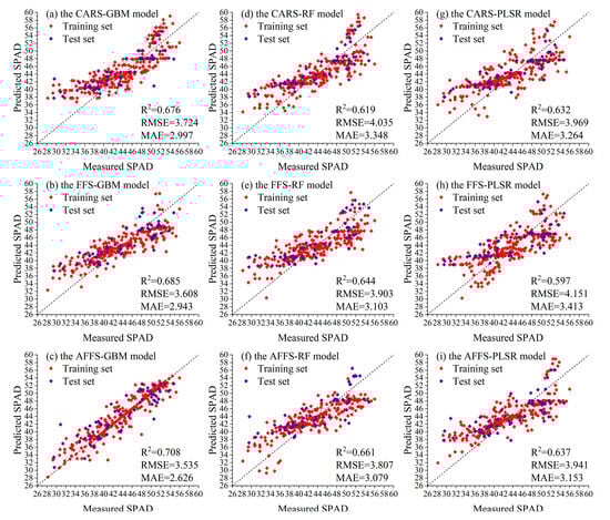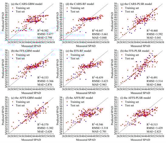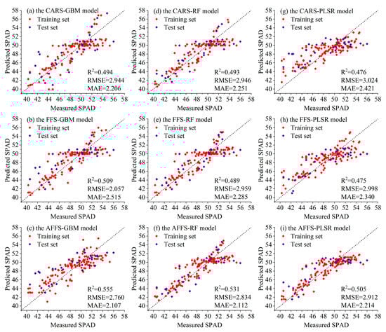Different VIs may contain some overlapping information, leading to a certain degree of information redundancy. Eliminating unnecessary VIs through feature selection is very important. As a result, the model can concentrate on the most discriminative and representative features, improving its capacity for generalization, avoiding overfitting, and lessening its computational load []. The findings indicate that the inversion outcomes of the AFFS algorithm are more precise. The results during the cross-growth stage are the best. The values of R2 reached 0.851 and 0.708, while the values of RMSE were 2.394 and 3.535. When working with data that has intricate and extremely non-linear interaction relationships, the CARS algorithm is unstable. It could produce less-than-ideal feature selection outcomes since it is unable to adequately represent the intricate relationships present in the data []. To avoid being trapped in local optimal solutions, an adaptive mechanism is employed to dynamically adjust the feature—selection strategy and adaptively alter the search direction in accordance with the feedback information obtained during the search process. As a result, the AFFS algorithm is capable of yielding the optimal inversion results. If VIs are not selected, the unselected VIs contain a large amount of repetitive and redundant information, which not only increases the computational burden of the model but also interferes with the model’s ability to capture critical information. The AFFS algorithm selects the most representative and discriminative VIs by dynamically modifying the weights of the VIs, which can provide more direct and effective information for the model and reduce the error of the model.