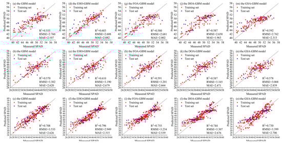 The CDE-EHO-GBM model outperforms other improved models on both the test and training sets. Especially during the cross-growth stage, the precision reached its highest level. The R2 values were 0.964 and 0.906, the RMSE values were 1.170 and 2.480, and the MAE values were 0.889 and 1.928, respectively. The greatest R2 value in our team’s earlier research was 0.600 during the seedling stage, 0.660 during the tuber expansion stage, and 0.870 during the cross-growth stage. In each growth stage, the optimal results of this study are significantly superior to those of previous research. Considering the great difficulty in enhancing the accuracy of scientific research, the findings of this study represent remarkable progress in comparison with prior investigations. The CDE-EHO-GBM model predicts canopy SPAD values with the highest accuracy, as seen in Figure 13, and is closest to the measured values. Table 11 shows the results of the optimal parameters of the optimal model for each stage in this study.