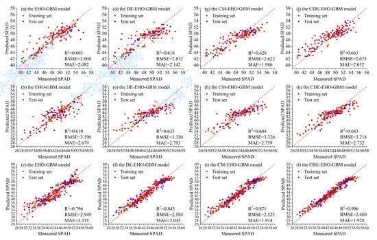 Scatter plots of inversion results of the GBM model based on improved optimization algorithms in the seedling stage, tuber expansion stage, and cross-growth stage, respectively. (a–c) Scatter plots of results of the GBM model with non-improved EHO. (d–f) Scatter plots of results of the DE-EHO-GBM model. (g–i) Scatter plots of results of the CM-EHO-GBM model. (j–l) Scatter plots of results of the CDE-EHO-GBM model.