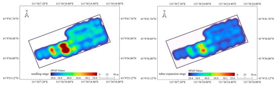 As can be seen from the above experiments, the CDE-EHO-GBM model proposed in this paper exhibits the best performance. We drew the temporal–spatial distribution map of canopy chlorophyll content based on the inversion results of this model, as shown in Figure 14. The canopy chlorophyll content is generally high during the seedling stage and relatively low during the tuber expansion stage. This is mainly because during the seedling stage, potato plants are in the vegetative growth phase. To meet the demand for intense photosynthesis, the chlorophyll content accumulates and increases rapidly at this time. When entering the tuber expansion stage, the focus of the plant’s physiological activities shifts to tuber maturation and nutrient accumulation. The leaves gradually senesce, the degradation of chlorophyll accelerates, and its content decreases.