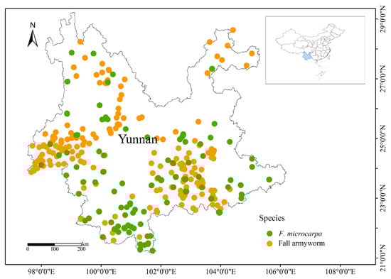 The distribution of fall armyworm and F. microcarpa in Yunnan Province, China.