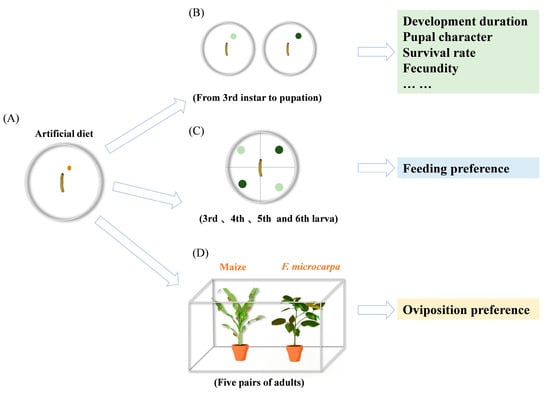 Maize and F. microcarpa seedlings with similar height and leaf area were selected for the experiment. One pot of each plant species was evenly arranged in a rearing cage (60 cm × 40 cm × 40 cm). A cotton ball soaked in a 10% honey–water solution was placed at the center of the cage to provide nutritional supplementation for adult moths. Newly emerged, mated female fall armyworm adults were introduced into the center of the cage. The number of eggs laid on maize and F. microcarpa plants was recorded daily; then we removed the eggs after counting them, and the oviposition preference index between the two plant species was calculated. Data collection continued until all female adults had died, with 30 replicates of adult individuals used in the experiment (Figure 2D).