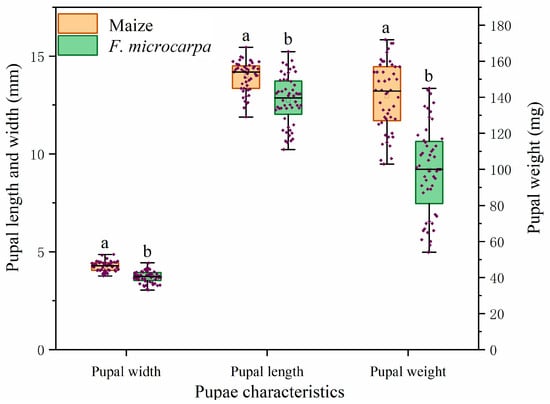 Differences in pupal characteristics of fall armyworm larvae feeding on maize and F. microcarpa. Data represent means ± SE, and different letters above the bars indicate significant differences (p < 0.05).