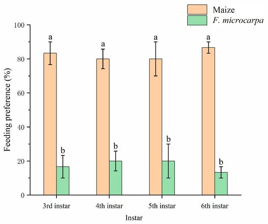 Feeding preference of fall armyworm at different instars for maize and F. microcarpa. Data represent means ± SE, and different letters above the bars indicate significant differences (p < 0.05).