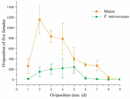 The oviposition peak of the fall armyworm feeding on maize occurred on the second day (mean ± SE = 1154.00 ± 276.06), whereas the oviposition peak for the fall armyworm feeding on F. microcarpa was observed on the fifth day (Mean ± SE = 241.67 ± 120.86). The oviposition for F. microcarpa then gradually declined until ceasing entirely on the ninth day when the adults died (Figure 7).