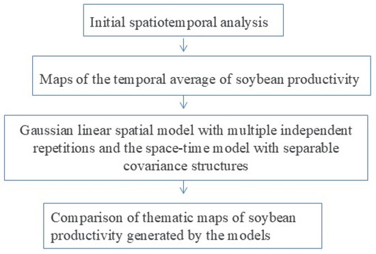 Initially, the spatiotemporal exploratory analysis of the soybean yield was carried out, considering the ten-year crop: 2012–2013, 2013–2014, 2014–2015, 2015–2016, 2016–2017, 2018–2019, 2019–2020, 2020–2021, 2021–2022, and 2022–2023. Subsequently, maps were created with the temporal averages of the soybean yield considering all the spatial locations, as well as the spatial averages of the soybean yield considering all the crop years. Finally, a Gaussian linear spatial model with multiple independent repetitions and a spatiotemporal model with a separable covariance structure were carried out (Figure 2).