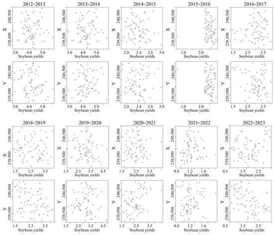 Regarding the temporal correlations of the soybean yields, the Pearson’s linear correlation coefficients between each crop year (Table 2) show a statistically significant linear correlation (p-value < 0.05) for the following pairs: 2012–2013 and 2016–2017; 2013–2014 and 2015–2016; 2013–2014 and 2016–2017; 2013–2014 and 2018–2019; 2013–2014 and 2019–2020; 2013–2014 and 2022–2023; 2014–2015 and 2016–2017; 2014–2015 and 2021–2022; 2014–2015 and 2022–2023; 2015–2016 and 2018–2019; 2015–2016 and 2022–2023; 2019–2020 and 2020–2021; and 2020–2021 and 2021–2022. These correlations were assessed using Fisher’s z-transformation test. In contrast, the correlations between other crop years were not statistically significant (p-value > 0.05).