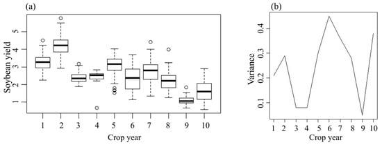 The boxplot of the soybean yield (t ha−1) ( outliers) (a) and the dispersion graph of the soybean yield variance (t ha−1) (b) in the following crop years: 2012–2013 (1), 2013–2014 (2), 2014–2015 (3), 2015–2016 (4), 2016–2017 (5), 2018–2019 (6), 2019–2020 (7), 2020–2021 (8), 2021–2022 (9), and 2022–2023 (10).