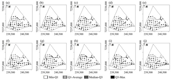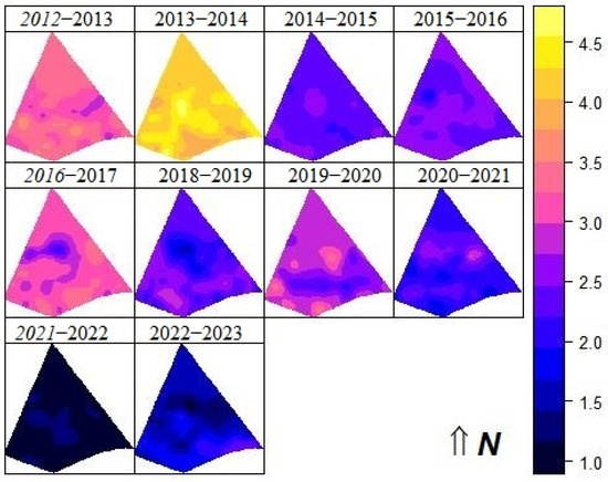 The post plot of the soybean yield (t ha−1) in the following crop years: 2012–2013 (a), 2013–2014 (b), 2014–2015 (c), 2015–2016 (d), 2016–2017 (e), 2018–2019 (f), 2019–2020 (g), 2020–2021 (h), 2021–2022 (i), and 2022–2023 (j) ( north direction).