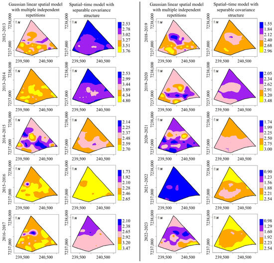 The map of the soybean yields (t ha−1), considering the Gaussian linear spatial model with multiple independent repetitions and the spatial time model with separable covariance structures, for the following crop years: 2012–2013, 2013–2014, 2014–2015, 2015–2016, 2016–2017, 2018–2019, 2019–2020, 2020–2021, 2021–2022, and 2022–2023 ( north direction).