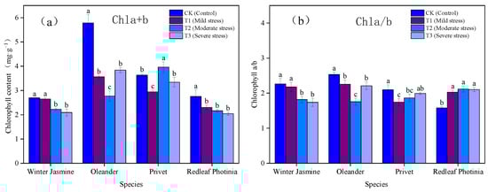 Chlorophyll content (a) and chlorophyll a/b ratio (b) of 4 plants under different gradients of drought stress. Different letters indicate significantly different data at p < 0.05.