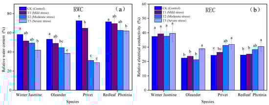 Drought stress markedly influenced the relative water content (RWC) and relative electrical conductivity (REC) of plant leaves (Figure 2). As the intensity of drought stress escalated, the RWC in leaves from all four plant species demonstrated a declining trend, ultimately reaching its nadir under severe stress conditions (Figure 2a). In comparison to the control group, the RWC values for Winter Jasmine, Oleander, Privet, and Redleaf Photinia decreased by 28.19%, 27.67%, 60.22%, and 13.39%, respectively. Additionally, drought stress resulted in a significant elevation (p < 0.05) in REC for Oleander, Privet, and Redleaf Photinia leaves under moderate to severe stress levels; although the increase observed in Winter Jasmine was not statistically significant, it still exhibited an upward trend (Figure 2b).