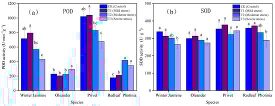 The effects of drought stress on the activities of peroxidase (POD) and superoxide dismutase (SOD) in the plants are shown in Figure 4. As shown in Figure 4a, the POD activity of Winter Jasmine and Privet decreased with the deepening of drought stress and was significantly lower than that of the control group under severe stress (p < 0.05). Compared with the control group, POD activity decreased by 39.64% and Privet decreased by 33.61% under severe stress. Different from Winter Jasmine and Privet, the POD activity of Oleander and Redleaf Photinia showed an increasing trend with the deepening of drought stress. The POD activity of Oleander under severe stress was significantly higher than that of the control group (p < 0.05), while that of Redleaf Photinia under mild, moderate, and severe stress was significantly higher than that of the control group (p < 0.05). Under drought stress, the POD activity of Winter Jasmine and Privet decreased, while the POD activity of Oleander and Redleaf Photinia increased, indicating that the adaptive ability of Oleander and Redleaf Photinia was stronger than that of Winter Jasmine and Privet. On the whole, SOD activity showed a decreasing trend under drought stress, but this decreasing trend was not significant for Oleander and Privet (p > 0.05), while that of Winter Jasmine and Redleaf Photinia was significantly higher than that in the control group only under severe stress (p < 0.05, Figure 4b).