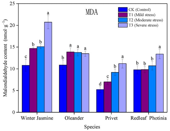 As an indicator of oxidative stress (Figure 5), malondialdehyde (MDA) content also exhibits an upward trend under drought stress, reflecting an increase in cell membrane damage. Winter Jasmine shows the most significant increase in MDA content under drought stress, indicating more severe cell membrane damage. The MDA content in Oleander also rises with increasing stress levels, but the magnitude of increase is relatively small, suggesting that Oleander can better maintain cell membrane stability under drought conditions. The trend in MDA content in Privet is similar to that in Oleander, but the overall accumulation is slightly higher. The MDA content in Redleaf Photinia remains relatively stable under mild and moderate stress, with a significant increase only observed under severe stress. This indicates that Redleaf Photinia can better maintain cell membrane integrity and reduce membrane lipid peroxidation damage under drought conditions.