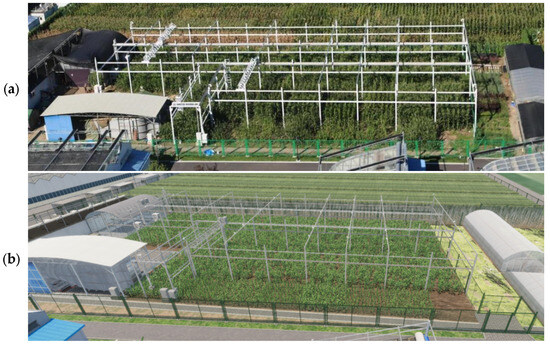 In this study, a digital twin base was constructed for an LQ-FieldPheno [7] experimental field at the Beijing Academy of Agricultural and Forestry Sciences (39°56′ N, 116°16′ E) (Figure 3). The real-world experimental field and phenological platform were accurately mapped (Figure 3a) and digitally reconstructed 1:1 to generate a virtual scene (Figure 3b) that includes the rail structure, sensor layout, and spatial distribution of crops and simulates the dynamic trajectory of the rail-based platform (Figure 3c). Through the two-way mapping of physical form (geometry and topology) and behavioral attributes (motion logic and equipment response), the digital twin realizes the in-depth synchronization of the virtual and real space and lays the foundation for subsequent real-time monitoring and adaptive regulation.
