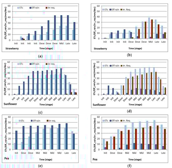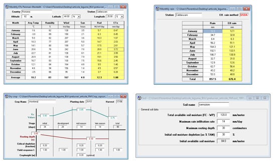 The choice of three different crops, pea, strawberry and sunflower, allows an overview of the study region’s capacity to adapt to different crop water requirements in different vegetation stages [,,]. Also, those crops are the ones that have extended their surface area in the last few years around Bucharest. The modeling of crop evapotranspiration, effective rain and irrigation requirements every 10 days was carried out using the Cropwat 8.0 software [,,].