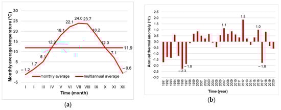 In the annual regime of the average monthly air temperature, for the period 1991–2020, the highest monthly average was recorded in July (+24.0 °C) and the lowest monthly average in December (−1.2 °C) (Figure 4a). The average annual thermal amplitude is 25.2 °C, which reflects the degree of continentality of the study area. In terms of annual thermal deviations from the multiannual average air temperature (11.9 °C), a higher frequency of negative thermal deviations is observed in the first decade of the analyzed period. Starting with 2000, there are more positive thermal deviations, the highest value being recorded in 2012 of 1.8 °C (Figure 4b). The climatic changes observed in the air temperature regime are also highlighted by the decadal average values of the analyzed period. These values are 11.1 °C (1991–2000), 12.4 °C (2001–2010) being the warmest decade and 12.1 °C (2011–2020). As a result, after 2000, the air temperature increased compared to the first decade by 1.0 … 1.3 °C for the study area.