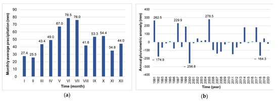 The annual regime of precipitation (a) and annual pluviometric anomalies (b) at the Căldărușani experimental evapometric station for the period 1991–2020.