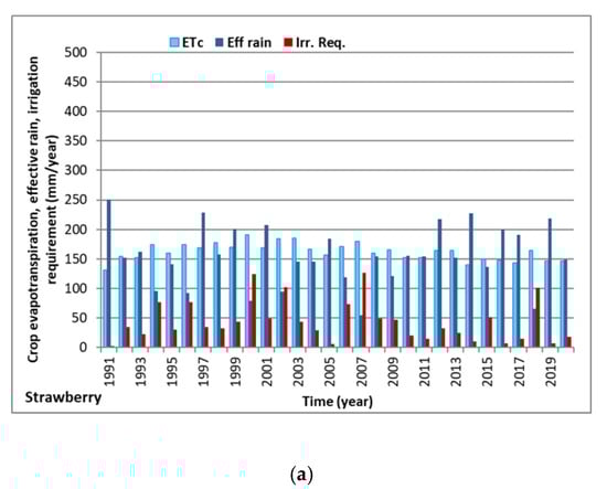 Annual variation of crop evapotranspiration (ETc), effective rain (Eff rain) and irrigation requirement (Irr. Req.) for strawberry (a), pea (b) and sunflower (c) crops, simulated with the Cropwat model (period 1991–2020).