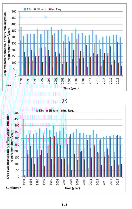 For the sunflower crop, the annual evapotranspiration values were higher than for the strawberry crop presented previously, due to the longer duration of the vegetation cycle and the more developed leaf apparatus (Table 3). Thus, in the time interval 1991–2020, the average value of evapotranspiration for the sunflower crop was 337 mm, varying between 288 mm (year 1991) and 394 mm (year 2000) (Figure 6). Effective rain for the vegetation period of the sunflower crop was on average 244 mm/year, with a maximum value of 449.3 reached in 1991 and a minimum of 100.2 mm in 2000. Irrigation requirement varies significantly from one year to another; minimum annual values resulting from simulations carried out for the year 1991 were Irr. Req. 9.8 mm (year with a strong surplus of precipitation), with maximum values of Irr. Req. of 317.4 mm in the year 2000 (year with a deficit in terms of precipitation). In the development stage, the sunflower crop requires an average of 12 mm; later in the mid-season stage, the water requirement reaches 94 mm (Figure 7).