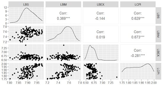 Based on SDG 2 and the focus of the study at the national level, we selected four variables for our analysis, and their descriptive summary is presented in Table 1. The selection of variables for this study was informed by Nkgadima and Muchopa [17]. Supply (LBS) refers to quantities of broiler meat provided for South African consumers. Imports (LBIM) are quantities of broiler meat bought from other countries. Exports (LBEX) are quantities of broiler meat sold to other countries. Inflation is the rate of increase in prices over a given period. This is monthly data from 2010 to 2021, and there are no missing values in the data. All variables are logarithmically transformed. Lbs is the dependent variable, while lbim, lbex and lcpi are independent variables. The p-values indicate a significant difference between these variables. Further details concerning the density-scatter plots and correlations are presented in Figure 1.