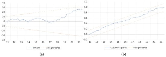 The depiction of CUSUM findings for the study—(a) CUSUM test. (b) CUSUM of squares test.