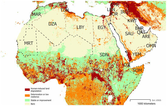 Human-induced land degradation in the countries of the Arab region. Original elaboration from data of human-induced degradation published by FAO SOLAW 2021 [1] and Coppus [2]. ISO 3 codes: Algeria = DZA; Bahrain = BHR; Djibouti = DJI; Egypt = EGY; Iraq = IRQ; Jordan = JOR; Kuwait = KWT; Lebanon = LBN; Libya = LBY; Mauritania = MRT; Morocco = MAR; Oman = OMN; Qatar = QAT; Saudia Arabia = SAU; Somalia = SOM; Sudan = SDN; Syrian Arab Republic = SYR; Tunisia = TUN; United Arab Emirates = ARE; Yemen = YEM. The map was prepared using ArcGIS PRO software, Redlands, CA, USA: Environmental Systems Research Institute (ESRI); 2023.