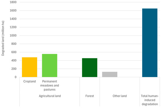 The mutual interactions between land and water resources and societal changes form the foundation of food production and the entire agrifood system, shaping their dynamics across time and space [1]. Human-induced land degradation has significantly impacted agrifood systems [2], driving their productive capacity in unsustainable directions and putting global food security, nutrition, environmental sustainability, and social stability at risk [3,4,5]. Recognition and action are needed to refocus attention on land, soil, and water resources, which produce over 95 percent of the world’s food [6] and support other essential ecosystem services such as feed, fiber, clean water, and air [7]. The FAO estimates that more than 1660 million hectares (Mha) of global land area are degraded due to unsustainable land use and management practices—referred to as human-induced land degradation [1]. The impacts of this degradation are particularly severe for the livelihoods of those who depend on natural resources [8,9].