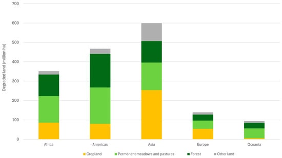 Regional distribution of human-induced land degradation by land use. The composition of countries within each region is based on the regional aggregates from the FAOSTAT Land Use database [20].