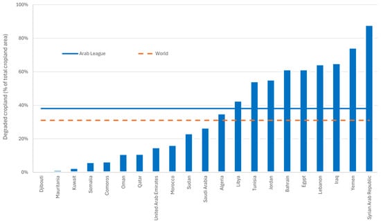 Share (%) of degraded cropland relative to total cropland area for countries of the Arab region, with regional and global averages.