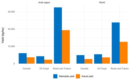 Averaged attainable and actual yields (kg/ha) by crop group for countries in the Arab region and globally.