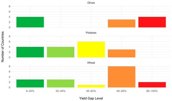 Number of countries by yield gap level for olives, potatoes, and wheat. Yield gap categories: 0–20% (limited), 20–40% (moderate), 40–60% (significant), 60–80% (severe), and 80–100% (very severe).