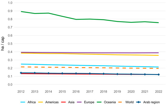 Global and regional availability of cropland area per capita (ha/cap), 2012–2022. Adapted from the FAOSTAT Land Use database [20].