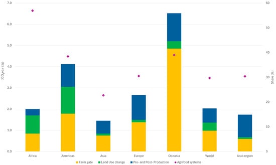 Per capita greenhouse gas emissions (GHG) by component of agrifood systems (farm gate, land use, and pre- and post-production), with the share of agrifood systems in total economy-wide emissions shown on the secondary axis—averaged by region for 2022. Adapted from the FAOSTAT Emissions totals database [39].