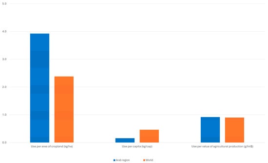 Pesticide use indicators—total pesticide use per area of cropland (kg/ha), per capita (kg/cap), and per value of agricultural production (g/Int$)—averaged for the Arab region and the world, 2022. Adapted from the FAOSTAT Pesticides Use database [40].