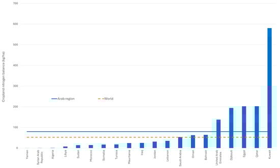 Figure 10 illustrates the substantial disparities in the cropland nitrogen balance [43,44] among Arab countries in 2022. The regional average nitrogen balance was 80 kg/ha—about 50% higher than the global average of 52 kg/ha. However, this average masks significant heterogeneity. For example, countries such as Kuwait and Qatar exhibit extremely high nitrogen surpluses (well above 100 kg/ha), reflecting intensive fertilizer use in irrigated agriculture systems. These surpluses are largely driven by policies that encourage high-input production, such as generous fertilizer subsidies in several countries of the region [45]. In contrast, countries like Yemen, Sudan, Mauritania, and Somalia have low or even negative nitrogen balances, reflecting limited access to fertilizers and less supportive policies, which can lead to nutrient depletion and declining soil fertility. Tailoring interventions to local conditions and policy frameworks will be crucial for achieving both productivity and sustainability across the diverse agricultural systems of the Arab region [22].