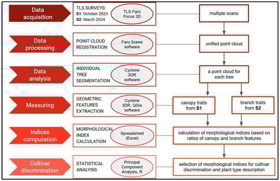 Two Terrestrial Laser Scanning (TLS) surveys were carried out on hazelnut plants from four different hazelnut cultivars: one in October 2023 (hereafter referred to as S1—with foliage) and another in March 2024 (hereafter referred to as S2—without foliage). The resulting high-resolution 3D point clouds were segmented to isolate individual trees, on which geometric traits were measured. These traits were then used to calculate morphological indexes based on specific ratios. Finally, the full set of descriptors was statistically analysed to assess their ability to discriminate among cultivars, as well as plant types, i.e., grafted plants or own-rooted ones (Figure 1).