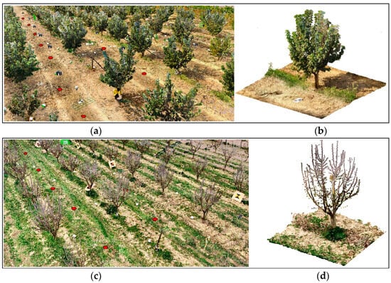 The laser scans were processed using Faro Scene software v. 2021.4.0 (Faro), which automatically recognizes spheres and checkerboard targets for alignment (Figure 4a,c) in a local coordinate system. The resulting average planimetric and altimetric errors were approximately 1.62 cm and 0.61 cm for the October 2023 survey, and 1.23 cm and 0.89 cm for the March 2024 survey. The total point cloud was then processed using Cyclone 3DR software v. 1.7.5 (Leica Geosystem—Part of Hexagon), resulting in a mean point spacing of less than 0.5 cm. Subsequently, the point cloud from each survey was segmented to isolate individual trees (Figure 4b,d).