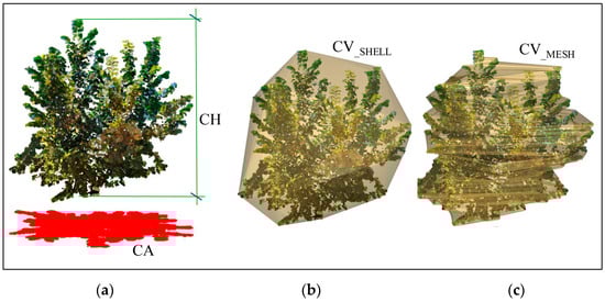 - Canopy volume (CV), estimated using two different approaches: a shell (CVSHELL), a convex surface enclosing all the canopy points and accounting for the empty spaces between branches (Figure 5b) and a mesh (CVMESH) derived from the “tree meshing script” in Cyclone 3DR (Figure 5c), which uses horizontal slices with assigned depth at regular intervals in the Z direction;