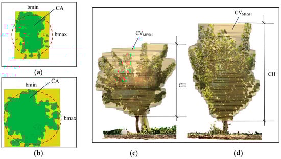 - bmin and bmax, the minimum and maximum planimetric dimensions, respectively, of a bounding box (the yellow box in Figure 6a,b) around the canopy projection, obtained in a GIS environment;