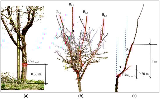 Geometrical features extracted from the March 2024 survey: trunk circumference (a); length and radius of the branches (b); branch angles (c).