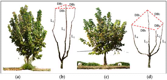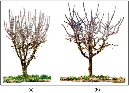These traits of interest are easily recorded on young and unpruned trees, while there are many difficulties in measuring a substantial number of architectural traits in a large tree modified by pruning []. In apple, almond and olive orchards [,,], TLS technologies have been used to identify different architectural groups.