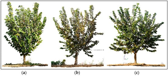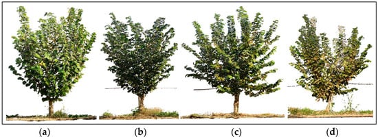 According to another study [], which used 3 trees per cultivar/plant-type combination, and considering that the first aim was, first of all, to set up a methodology using laser scanning, thirty-six hazelnut trees were selected among the following cultivars: Tonda Gentile delle Langhe (hereafter referred to as TGL or T.G. Langhe), Tonda di Giffoni (hereafter referred to as TG or T. Giffoni or Tonda Giffoni), Tonda Francescana® (hereafter referred to as TF or T. Francescana) and Tonda Gentile Romana (hereafter referred to as TR or T. Romana). All these plants are of the same age and have been managed using the same agronomic techniques and grown in the same environmental conditions. TGL and TG, according to the descriptors for hazelnut [], are classified as having an intermediate tree vigour and branching density, while TR has a low tree vigour and sparse branching density. TF® is a new cultivar obtained by crossing TG × TR, so its growth habit has not been defined yet.