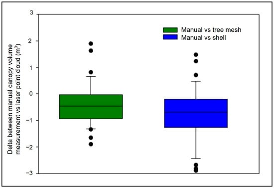 Canopy area was derived by projecting the canopy points onto the horizontal plane and extracting the crown contours in Cyclone 3DR, while area measurement was performed in QGIS. Canopy volume was automatically calculated using the “Tree Meshing” script and the “Convex Hull” tool in Cyclone 3DR. Canopy height was directly obtained from the point cloud attributes [].